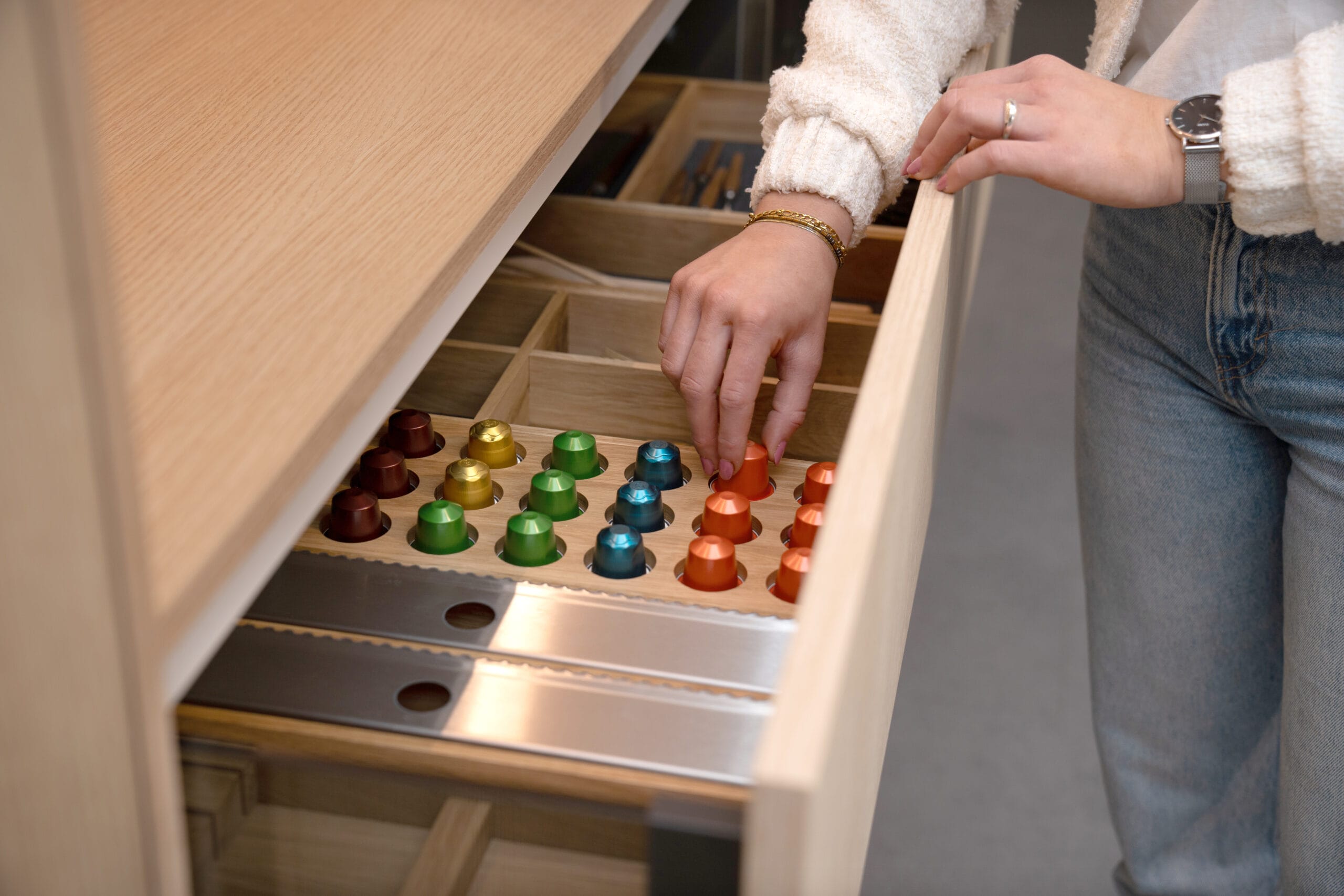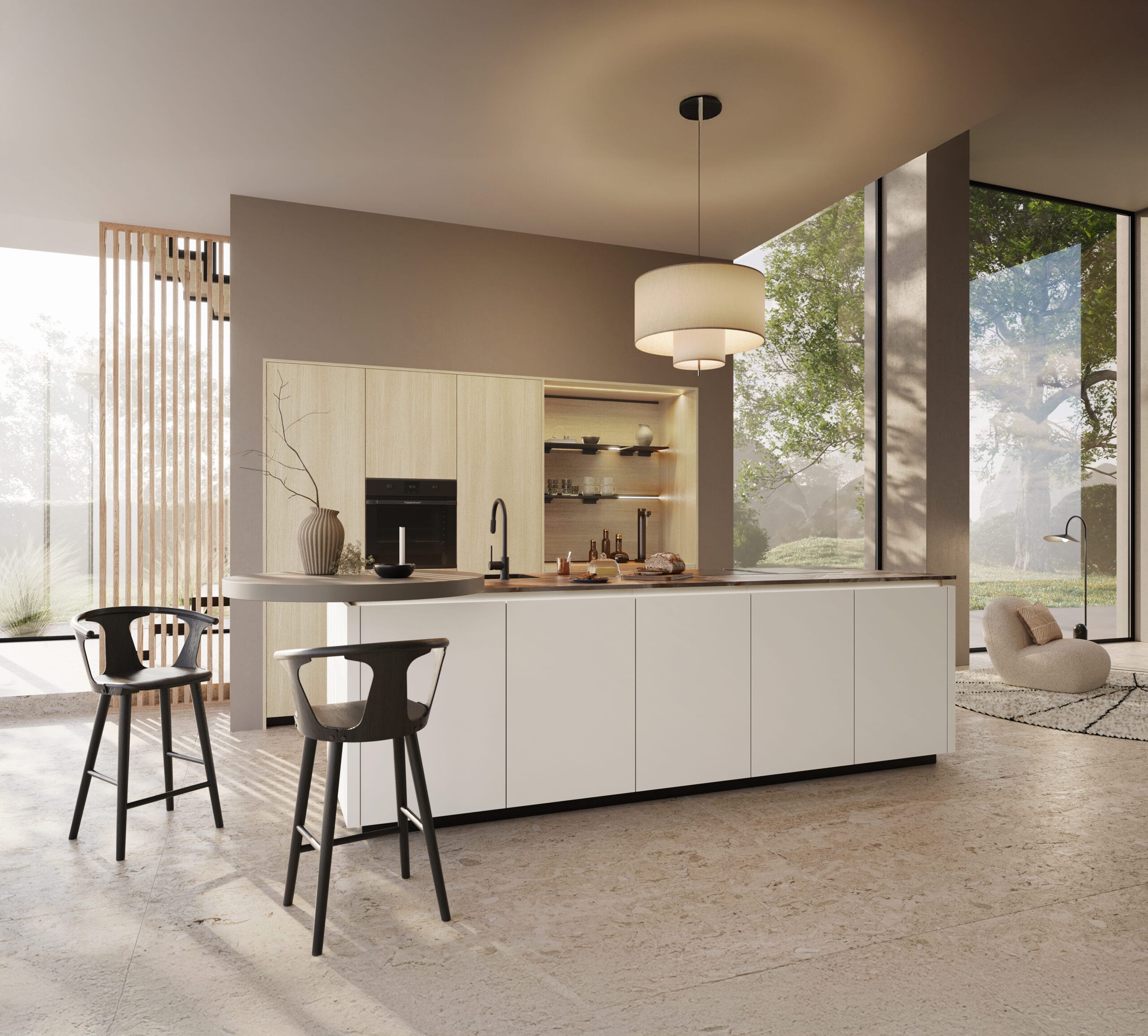 Het lichte Loft Nordic Oak in combinatie met strakke, zachtgrijze kasten zorgt voor de minimalistische uitstraling van deze keuken. Aan het ruime kookeiland met opvallend rond barblad is het zowel heerlijk koken als gezellige bijkletsen met je gasten. De hogere werkhoogte biedt je een ideale keukenmaat én zorgt voor nog meer opbergruimte.
