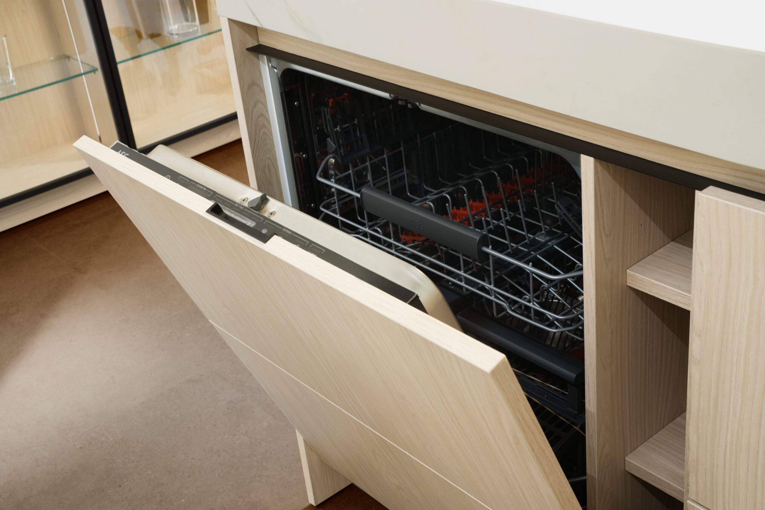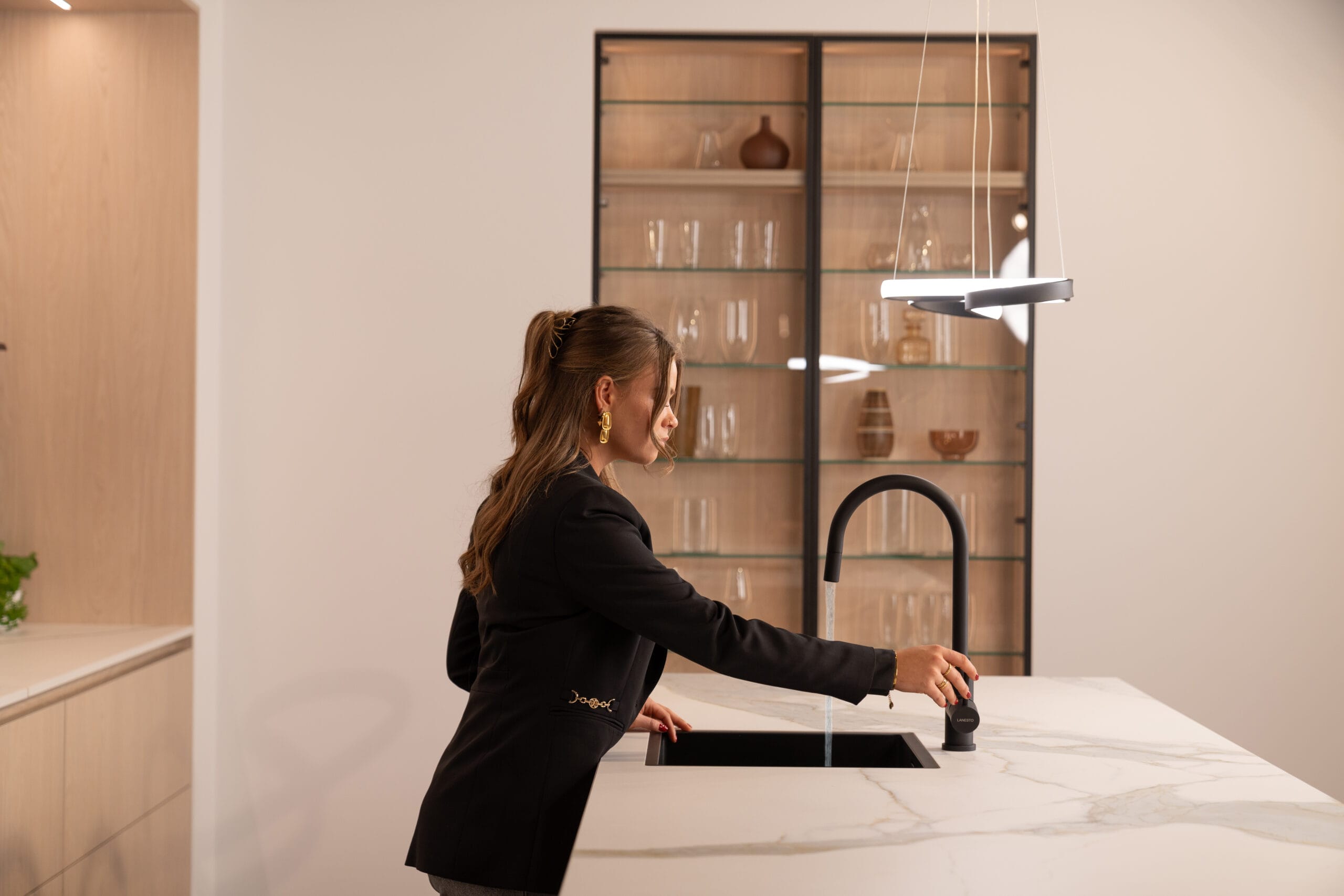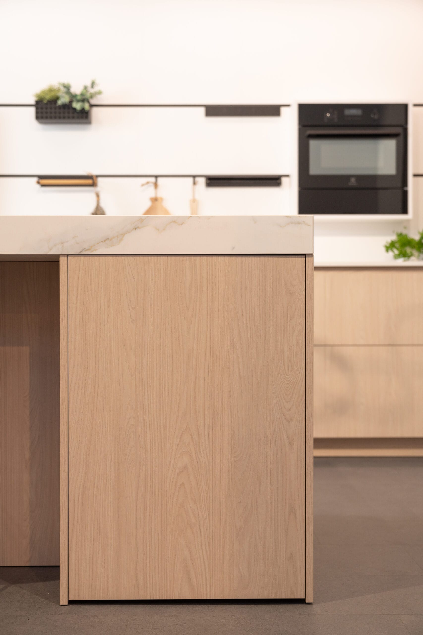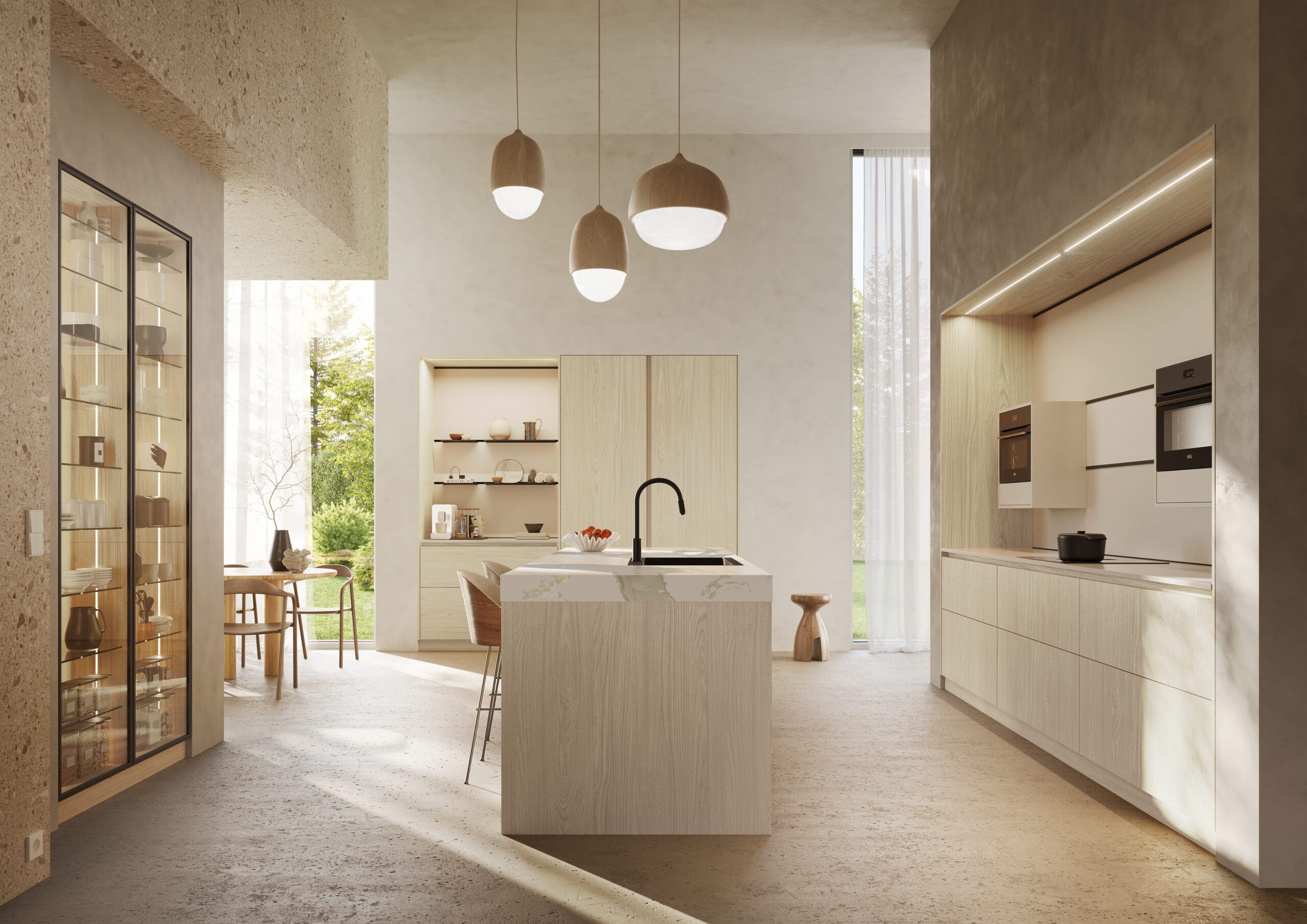 Deze keuken combineert moderne elegantie met een warme, natuurlijke sfeer. Het minimalistische design, met licht hout en subtiele, ingebouwde verlichting, zorgt voor een rustige en ruimtelijke uitstraling. Het centraal geplaatste kookeiland is zowel functioneel als stijlvol, met voldoende werkruimte en een opvallende zwarte kraan als contrast. De houten kasten bieden veel opbergruimte en de geïntegreerde apparatuur zorgt voor een strak geheel. Wanneer je kiest voor de combinatie van greeploos design en glaskasten, geef je je keuken een open en uitnodigend gevoel. Ideaal voor liefhebbers van een moderne woonstijl met een warme, natuurlijke touch, en perfect voor wie op zoek is naar zowel praktisch gebruiksgemak als een schitterende uitstraling.