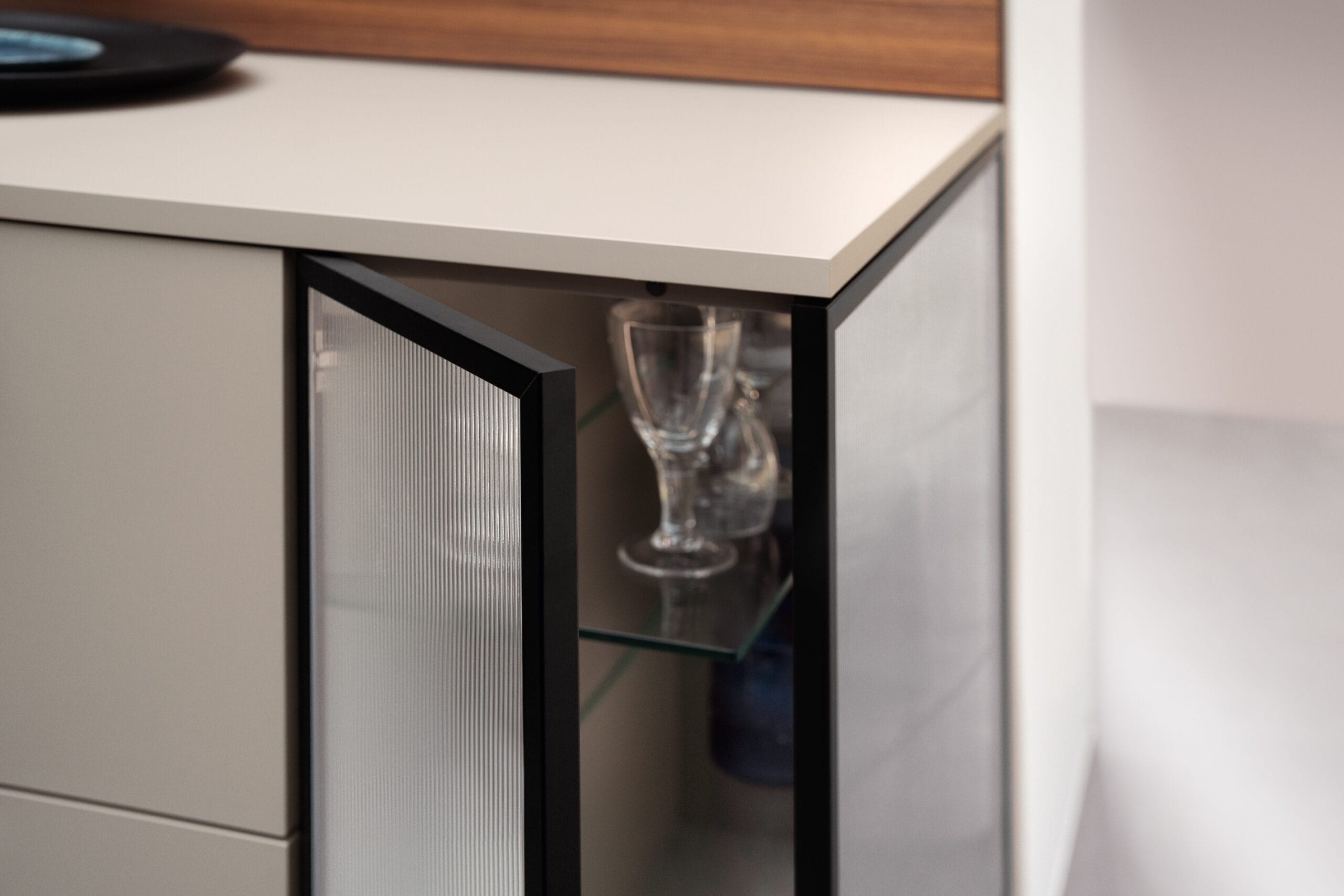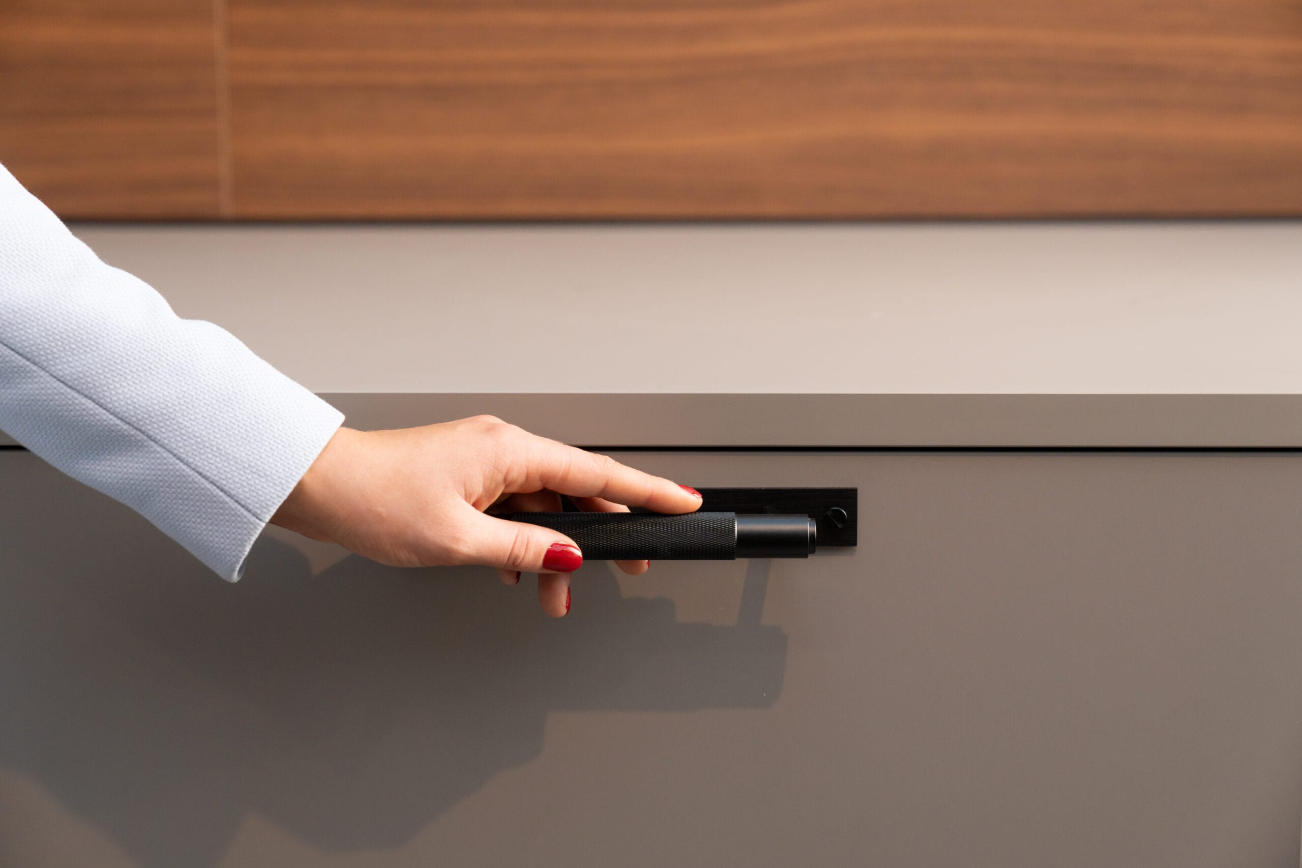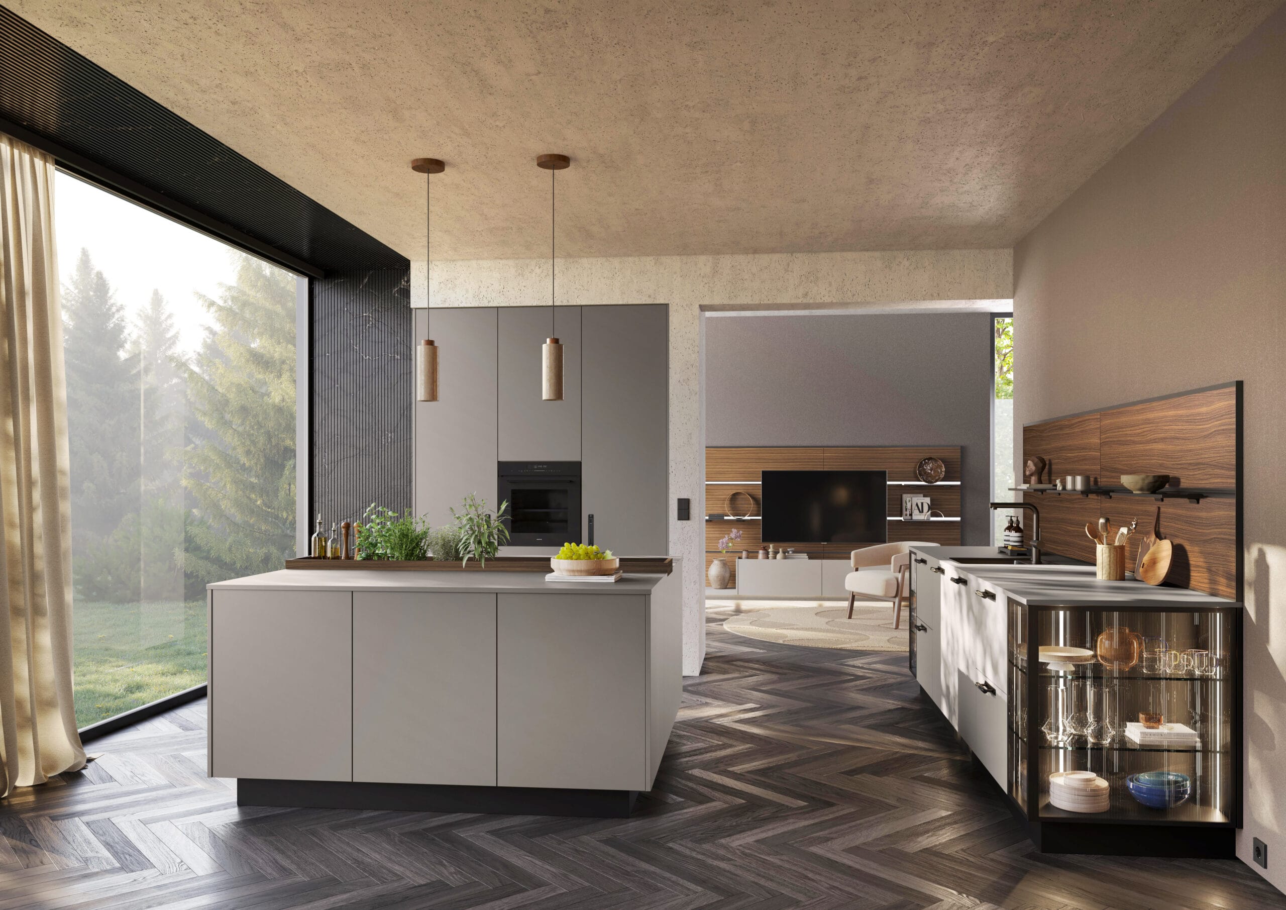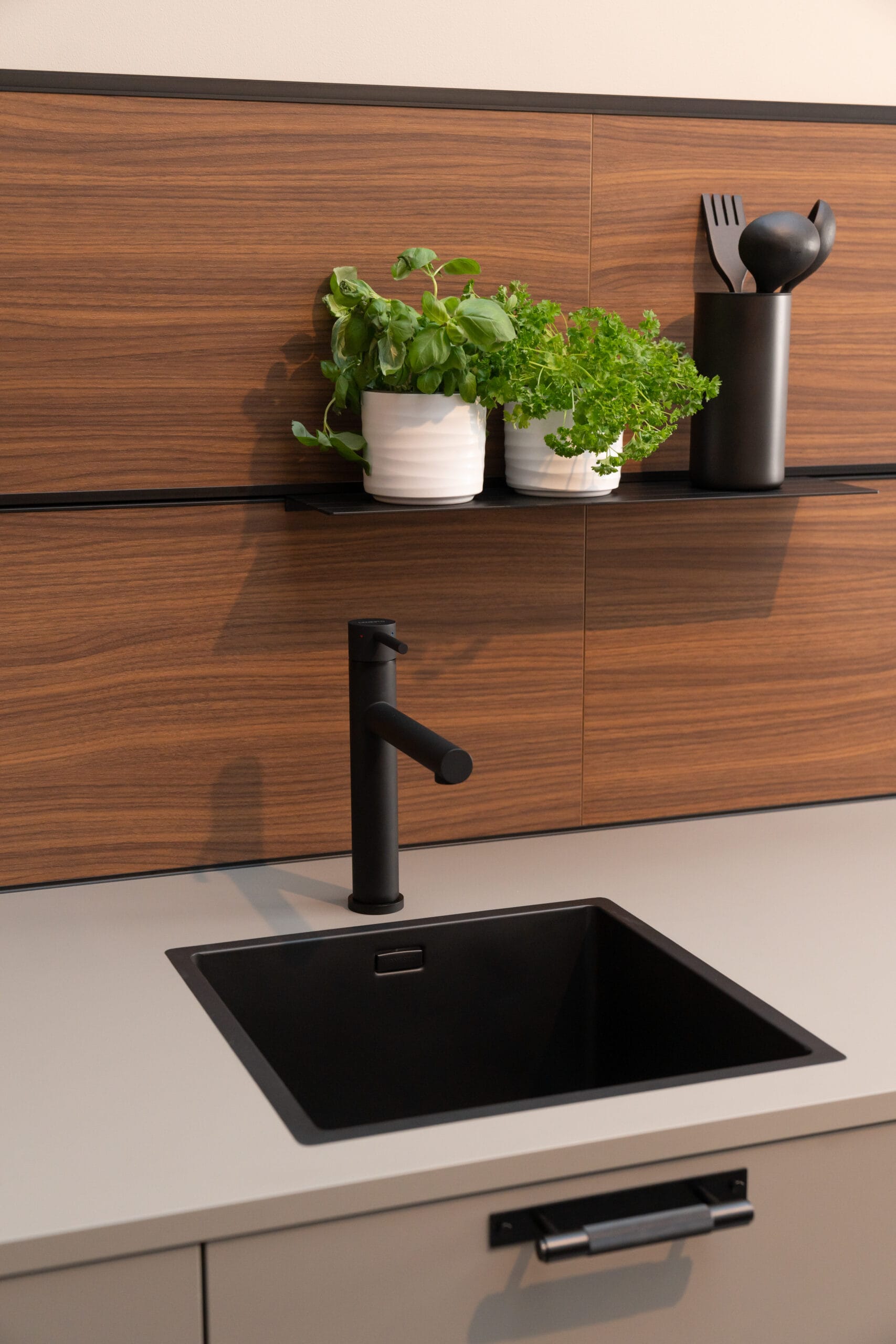 Deze keuken ademt moderne luxe en verfijning. Het strakke, minimalistische ontwerp met de combinatie van kasten in de kleuren Umbra en Clay Dark en donkere houten accenten straalt elegantie uit. Aan het kookeiland in Italian Walnut is het niet alleen heerlijk koken, maar ook gezellig bijkletsen. De subtiele verlichting en hoogwaardige materialen zorgen voor een warme, uitnodigende sfeer. Met voldoende opbergruimte en ingebouwde apparatuur is deze keuken zowel praktisch als stijlvol. De warme houten achterwand voegt een vleugje natuur toe. En: Wall Solutions laat je de achterwand precies zo indelen zoals jij ‘m wilt. Dit is de perfecte keuken voor wie houdt van een moderne, verfijnde keuken met een tijdloze uitstraling.