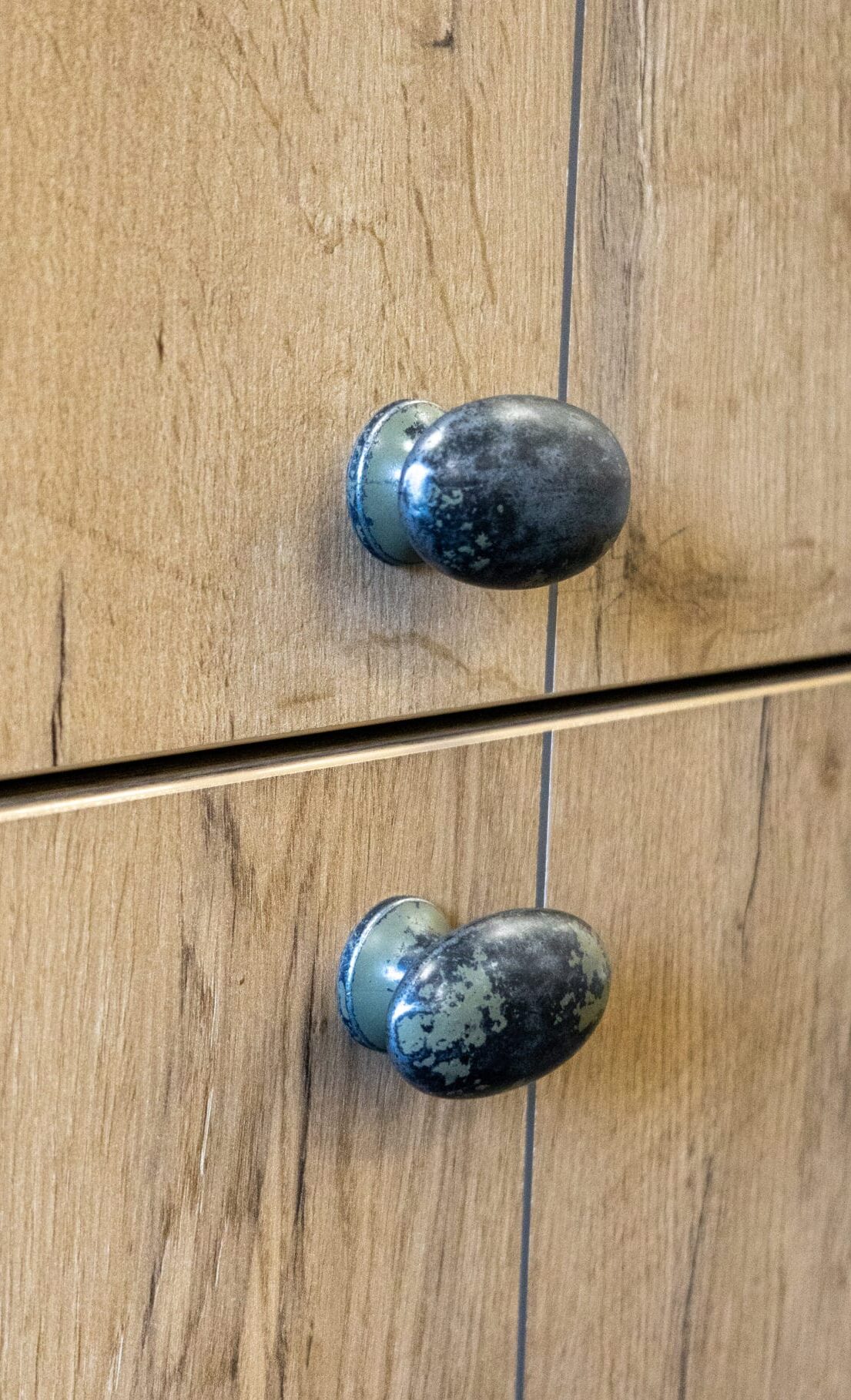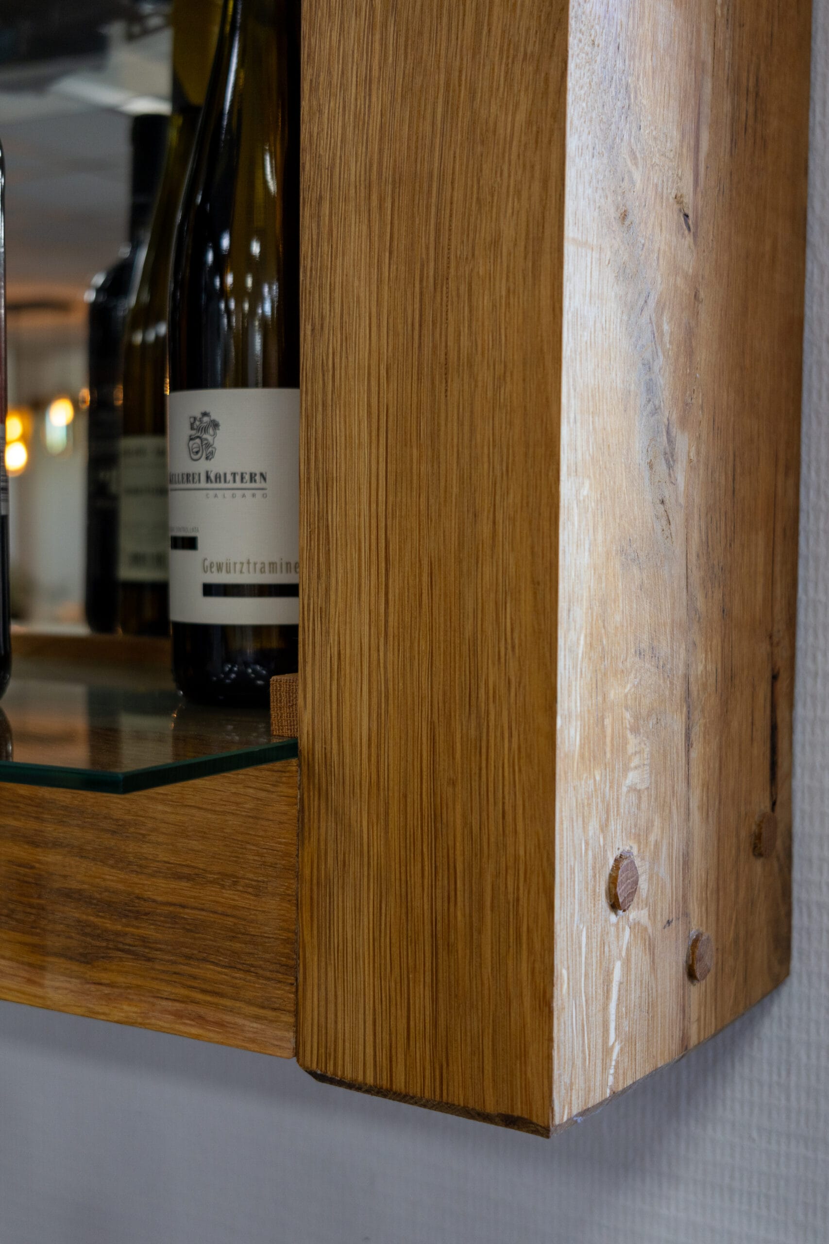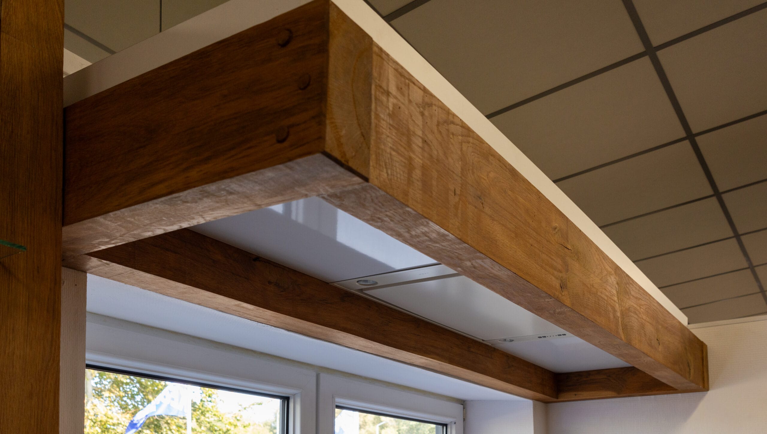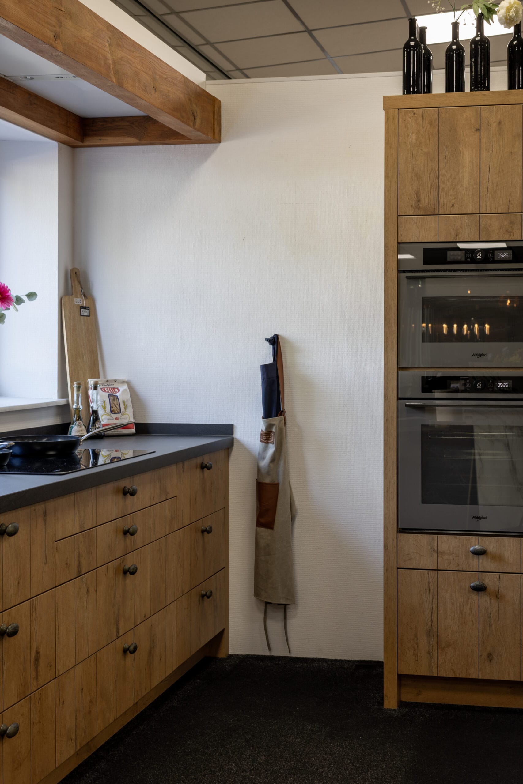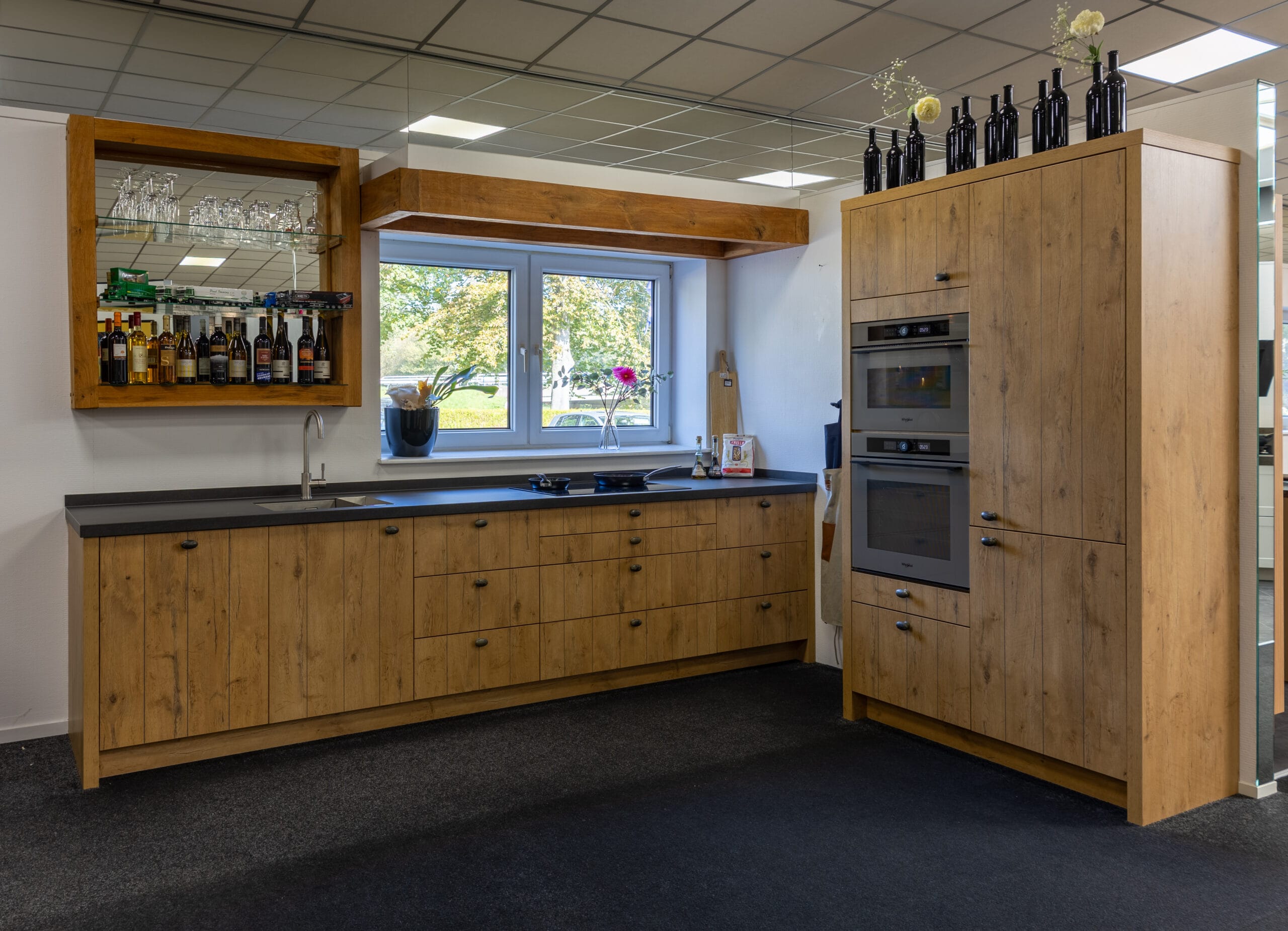 De keuken heeft rondom kunststof fronten met een strak streeppatroon en is uitgevoerd met een knop als greep. De corpus en plinten zijn uitgevoerd in old wild oak, wat zorgt voor een warme, natuurlijke uitstraling. In het lange keukendeel bevinden zich de kookplaat, spoelbak en vaatwasser. De hoge kasten bevatten een koel-vriescombinatie, oven en combimagnetron. Boven het lange werkdeel is een douglas koof geplaatst, naast een douglas kast met glazen plateaus. Onder de spoelkast en koeler is een aluminium bodem toegepast. Alle scharnieren en lades zijn voorzien van geïntegreerde demping; de lade-korven zijn afgewerkt met veiligheidsglas.
