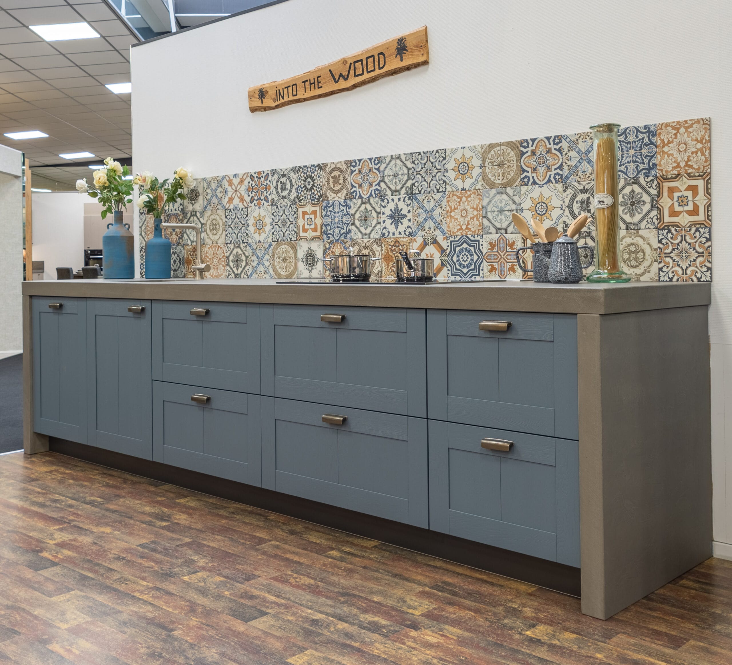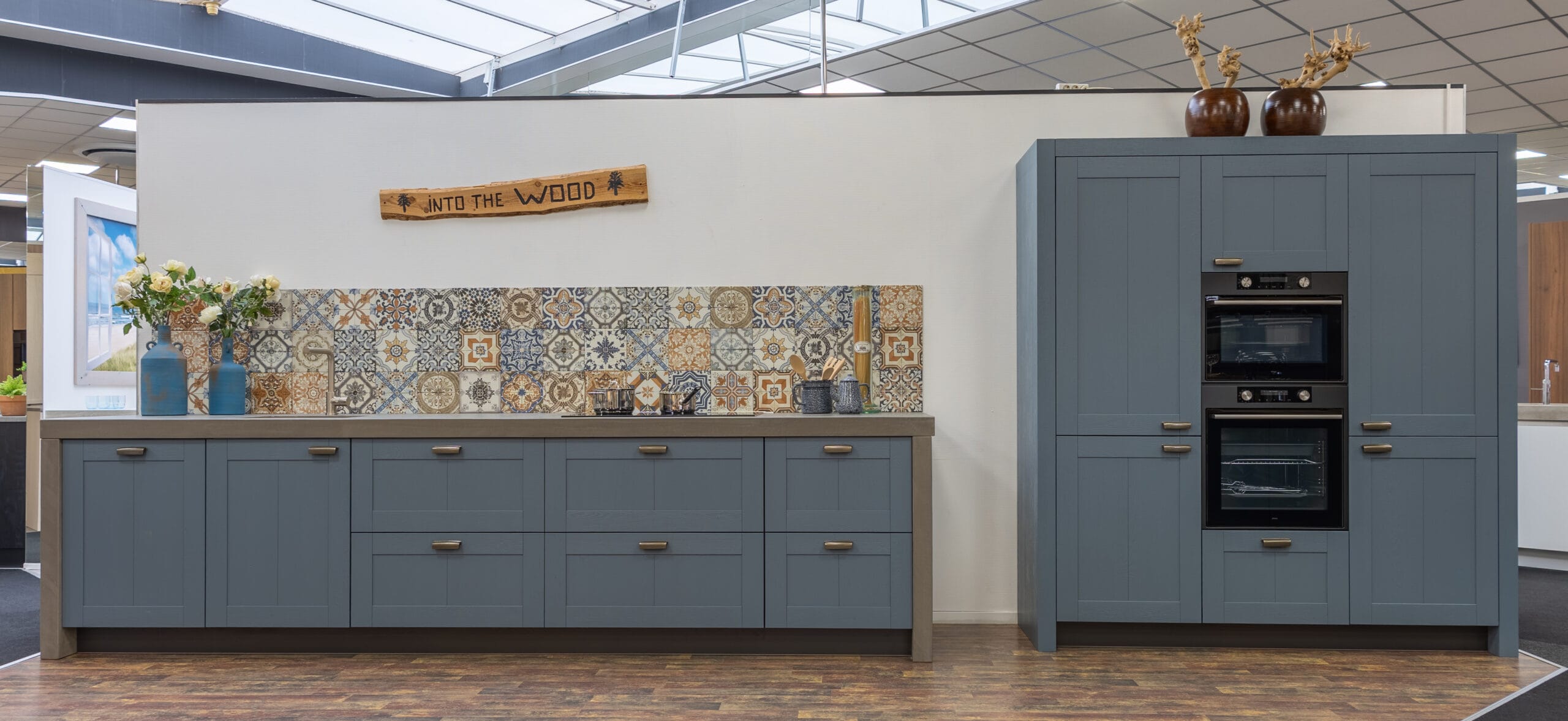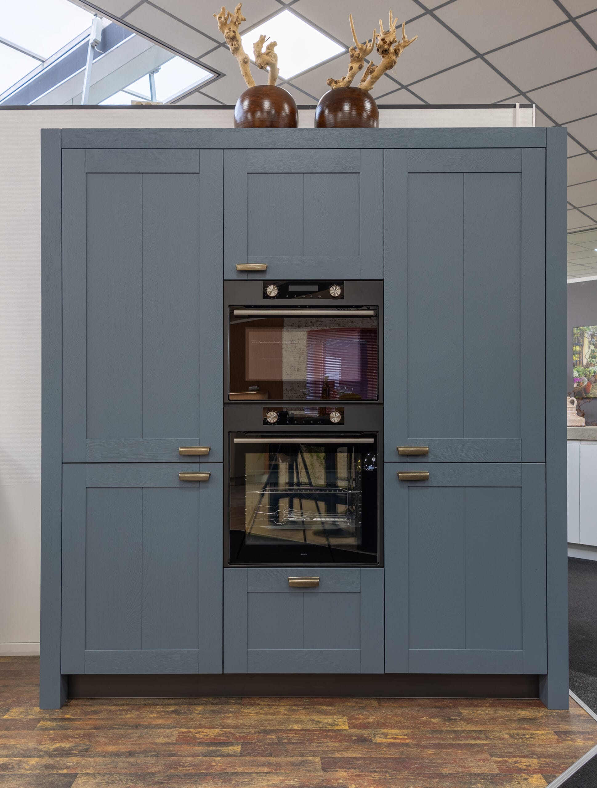 Deze keuken is uitgevoerd met hoogwaardige materialen en een doordachte afwerking tot in detail. De fronten zijn voorzien van een massief eiken toplaag met een geborstelde structuur, afgewerkt in de karaktervolle kleur Retroblauw. De zichtbare houtnerf zorgt voor een natuurlijke en ambachtelijke uitstraling, met behoud van een strak geheel. De binnenzijde van de keuken is uitgevoerd in de kleur Carbon, wat zorgt voor een rustig en modern contrast met de fronten. Dit geldt ook voor de plinten onder de keuken, die naadloos aansluiten op het interieur van de kasten. Het keukenblok en de bijbehorende ladekasten zijn extra diep uitgevoerd, wat zorgt voor meer werkruimte en extra opbergcomfort. Bij de kookplaatkast is bewust gekozen voor ondiepere lades, passend bij de geïntegreerde afzuiging.