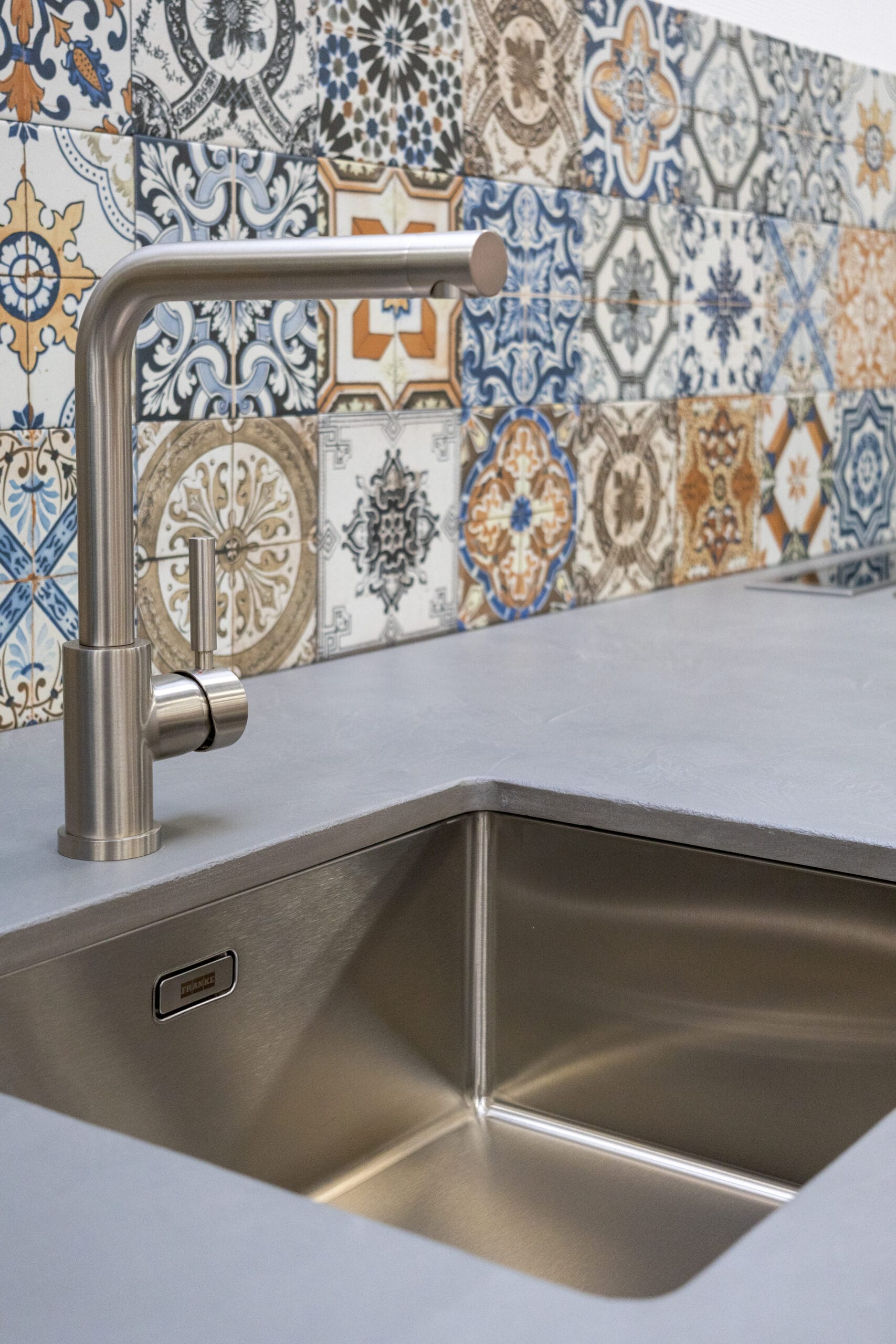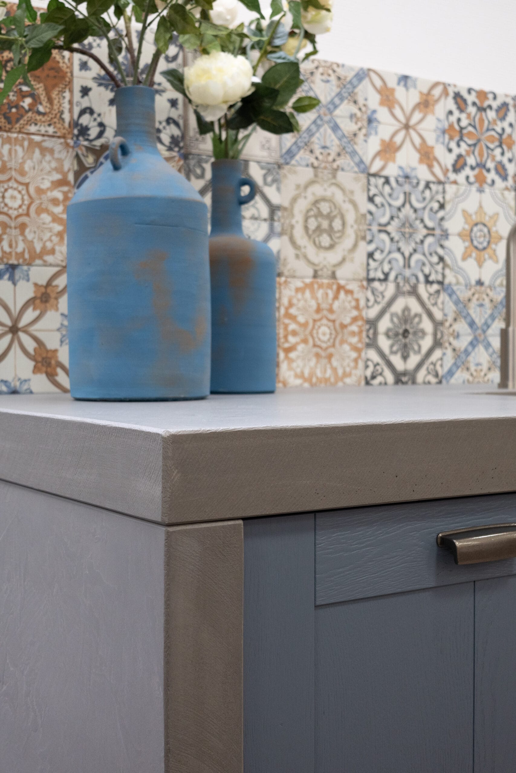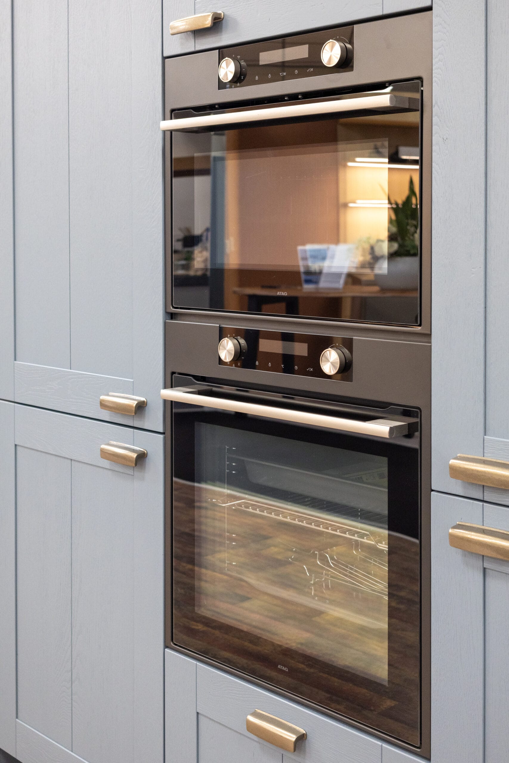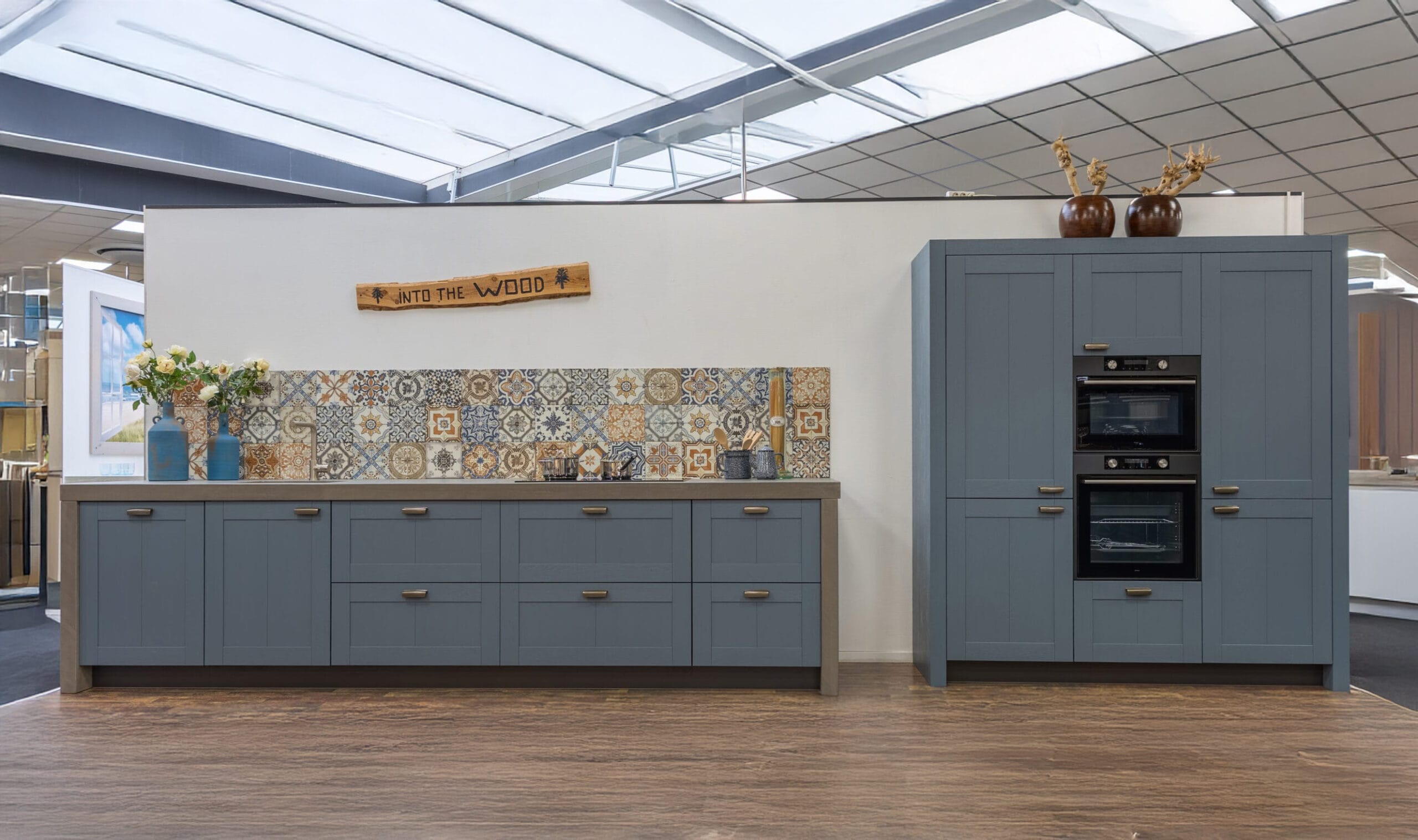 Deze keuken is uitgevoerd met hoogwaardige materialen en een doordachte afwerking tot in detail. De fronten zijn voorzien van een massief eiken toplaag met een geborstelde structuur, afgewerkt in de karaktervolle kleur Retroblauw. De zichtbare houtnerf zorgt voor een natuurlijke en ambachtelijke uitstraling, met behoud van een strak geheel. De binnenzijde van de keuken is uitgevoerd in de kleur Carbon, wat zorgt voor een rustig en modern contrast met de fronten. Dit geldt ook voor de plinten onder de keuken, die naadloos aansluiten op het interieur van de kasten. Het keukenblok en de bijbehorende ladekasten zijn extra diep uitgevoerd, wat zorgt voor meer werkruimte en extra opbergcomfort. Bij de kookplaatkast is bewust gekozen voor ondiepere lades, passend bij de geïntegreerde afzuiging.